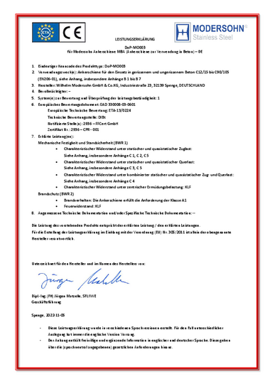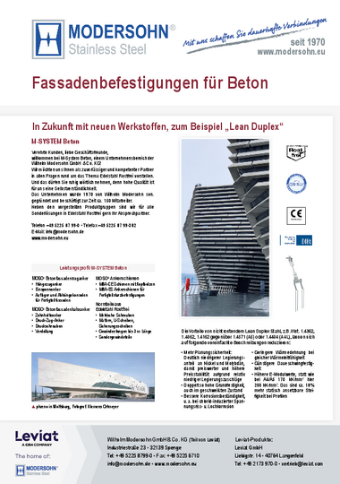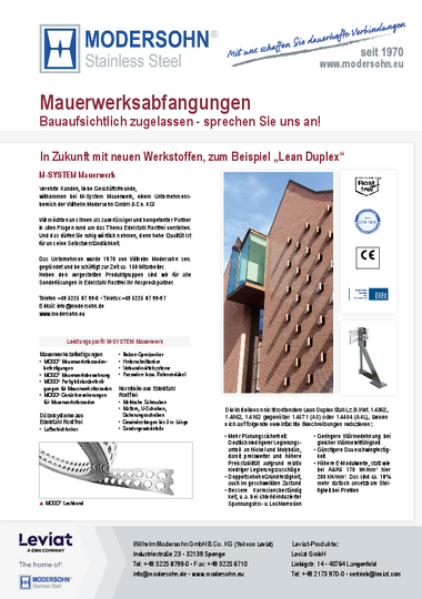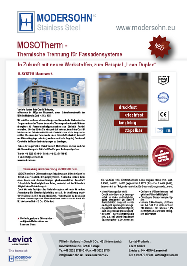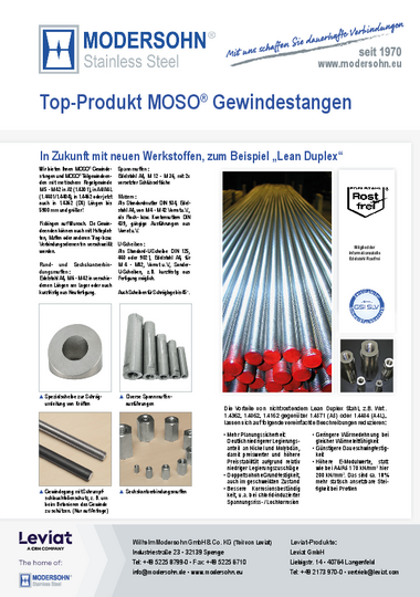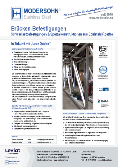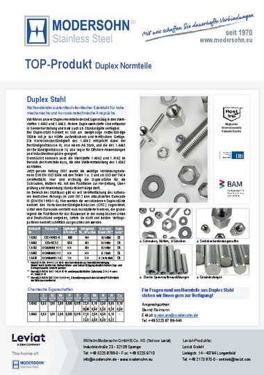 Im Jahr 2002 wird Wilhelm Modersohn durch die Fa. Avesta in Schweden auf den Werkstoff SAF2304 (1.4362) aufmerksam. Bereits 2003 erfolgt durch Fa. MODERSOHN die Einführung des 1. Lean-Duplex-Stahls für Sytemprodukte im deutschen Markt für Befestigungssysteme.